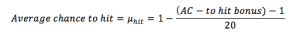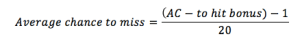 The decimal value can be multiplied by 100 to represent the % value if desired. Note also that there are boundaries not represented in equation but present in game rules, namely there is without advantage a 5% miss chance and at least a 5% critical hit chance represented by values on the d20. Last, the reason to use chance to miss will become apparent in Part 2.