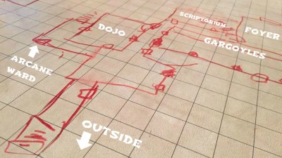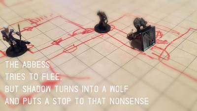 The bit when the party returns to Red Larch and finds that Harburk (“Hauberk” in our game) has taken over with Jalessa as mayor—that’s not really in the book. Not with as many umlauts anyway.
