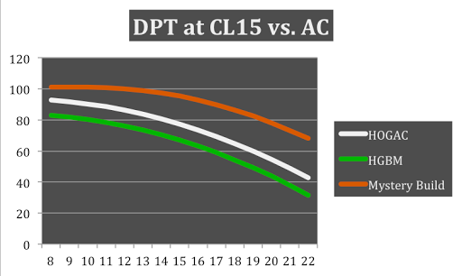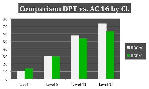 First, as promised, a brief discussion of Superiority Die (SD) will be made. An SD used for precision provides a great temporary boost for HGBM vs. HOGAC to DPT that increases based on AC. The effect can be demonstrated in examination of the figures tracing DPT at CL 15 vs. AC by identifying the target AC on the chart and subtracting 1d10 (average 5.5) from the AC for the new target AC, then a line can be traced up to the damage tracing of choice. This number can be compared against the DPT numbers at the original target to see the effect. The sizable effect represents using SD for every one of the 3 multi-attacks and the bonus attack.