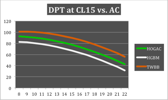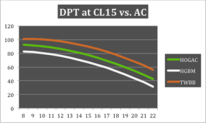 TWBB is compared to HOGAC and HGBM in average DPT at CL 15 vs. AC in the figure below.